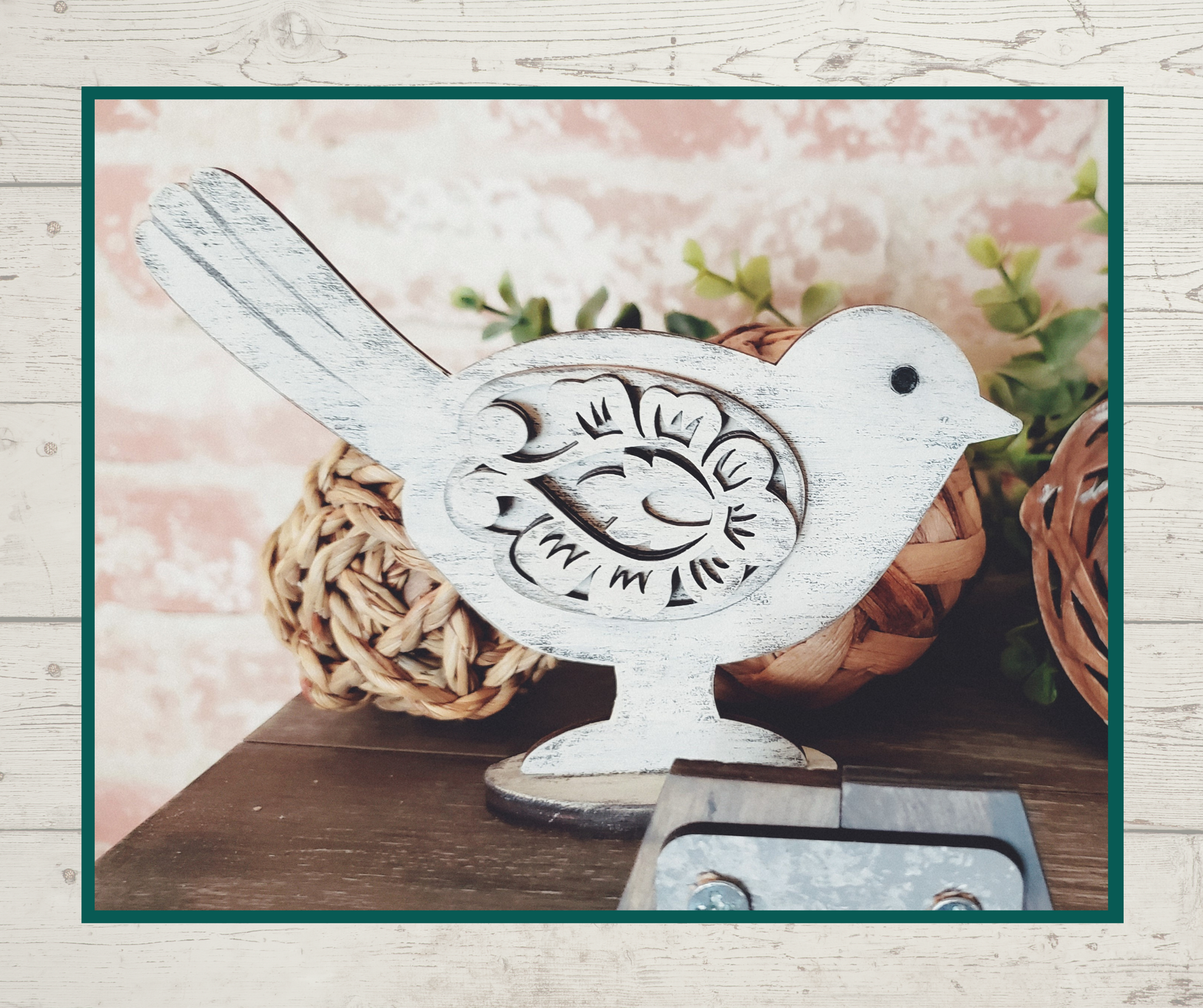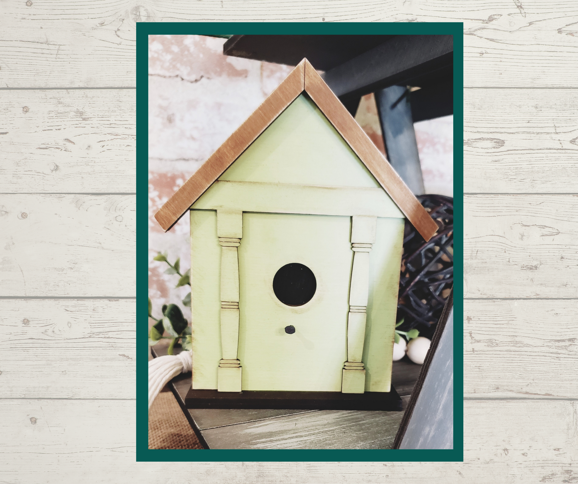 This tired tray includes a standing bird, a nest with a group of three eggs, a standing bird house, and a standing "bless our nest" sign.