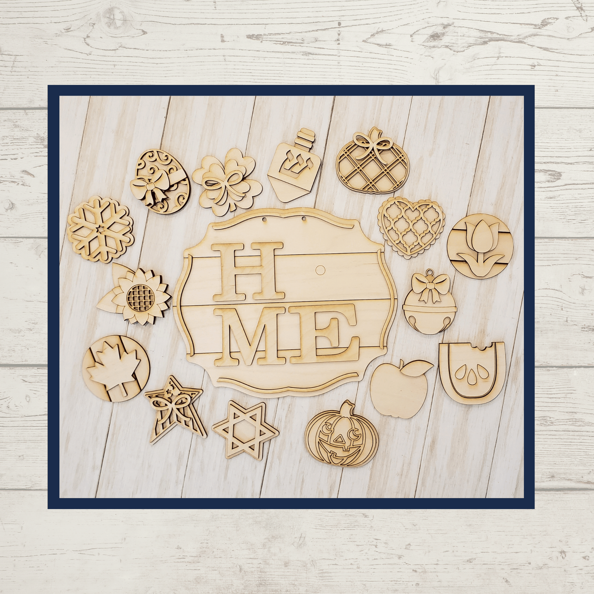 This includes a shelf leaner and a table sign version. Each version comes with the letter H, M, and E along with 15 different embellishments that can be used as the O. See the pictures for all of the embellishments available.