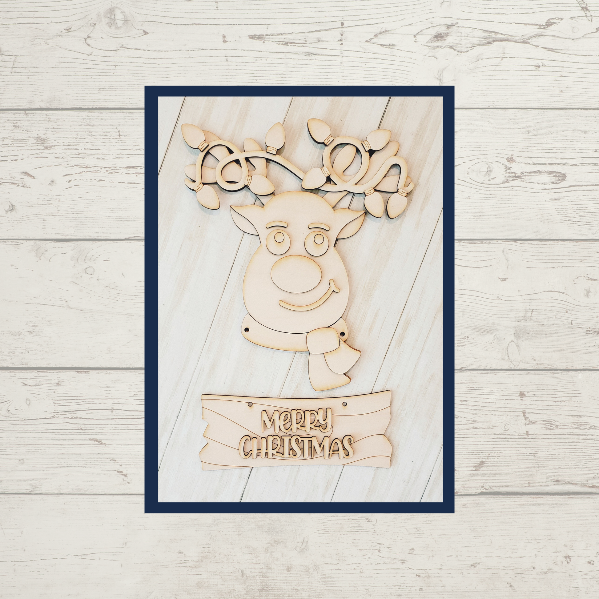 This includes the Rudolph backer, overlay pieces, lights and a wood grain sign that hangs from Rudolph. It also includes the text "Merry Christmas".