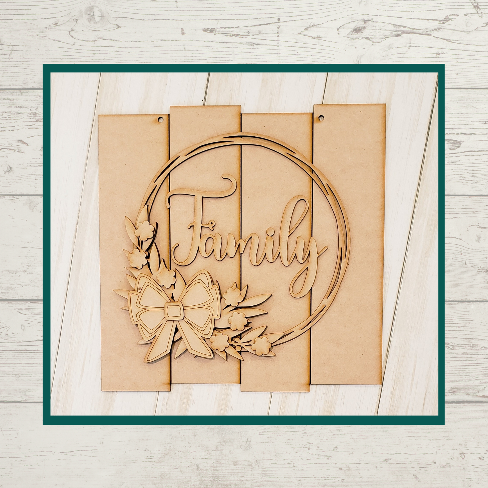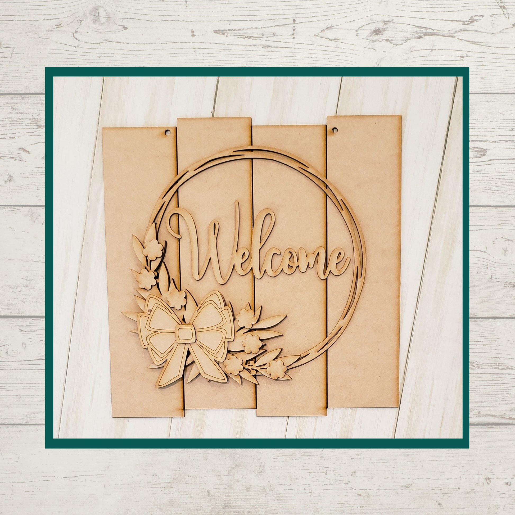 This includes the shiplap backer piece, a rustic wreath, leaves, flowers, bows, and the words welcome and family to use as you prefer.