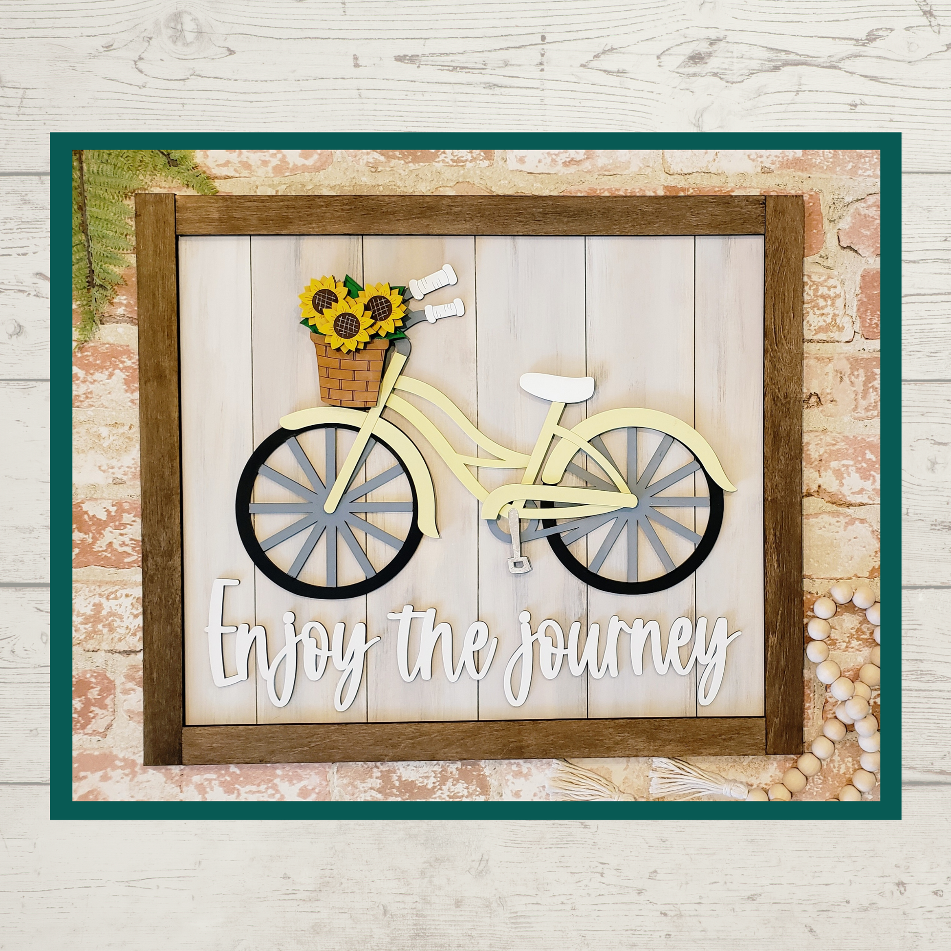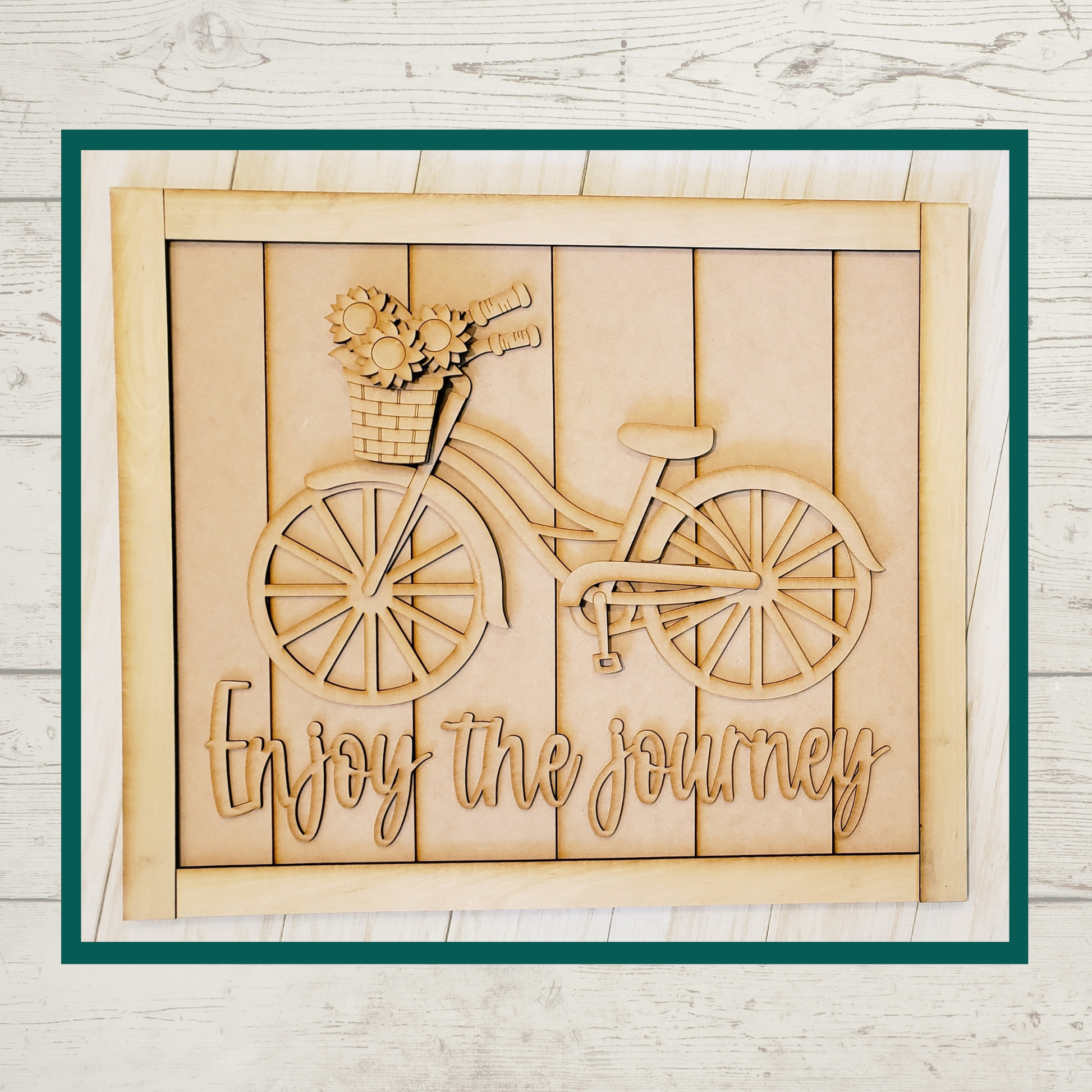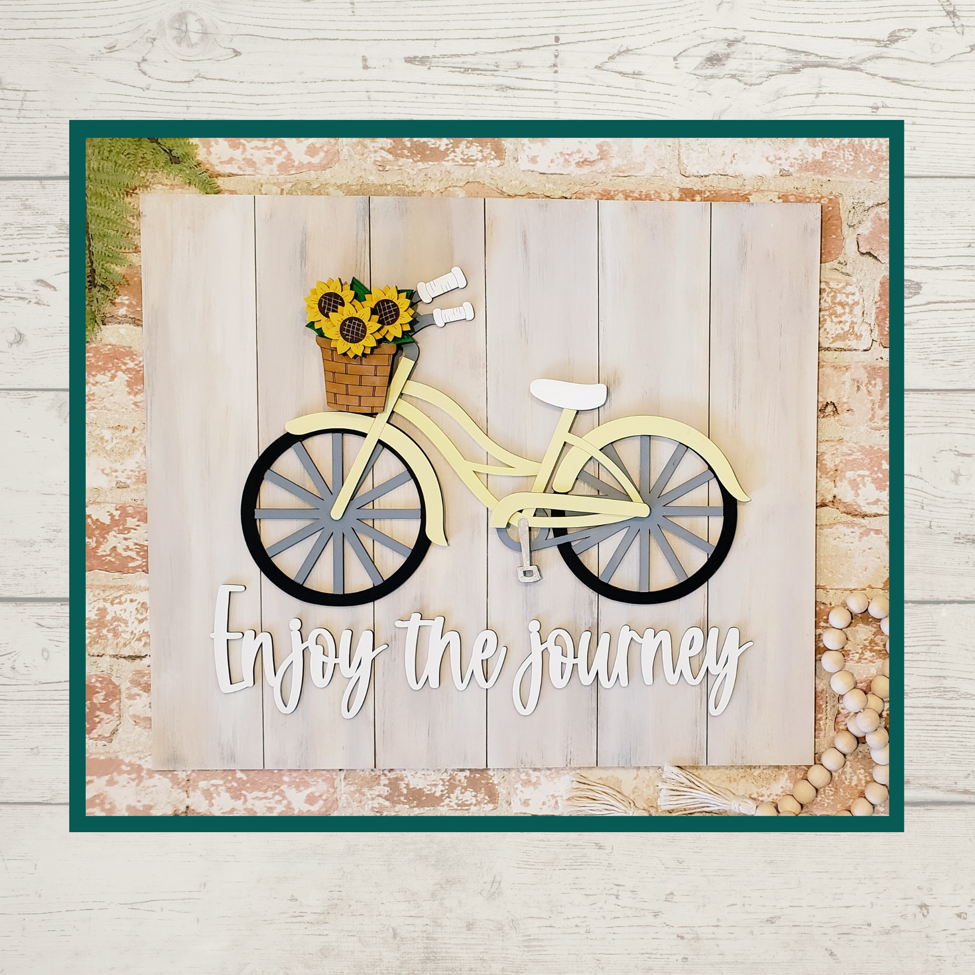 This includes the shiplap backer, optional frame, bicycle overlay pieces, basket with flowers, and letters for "Enjoy the Journey".