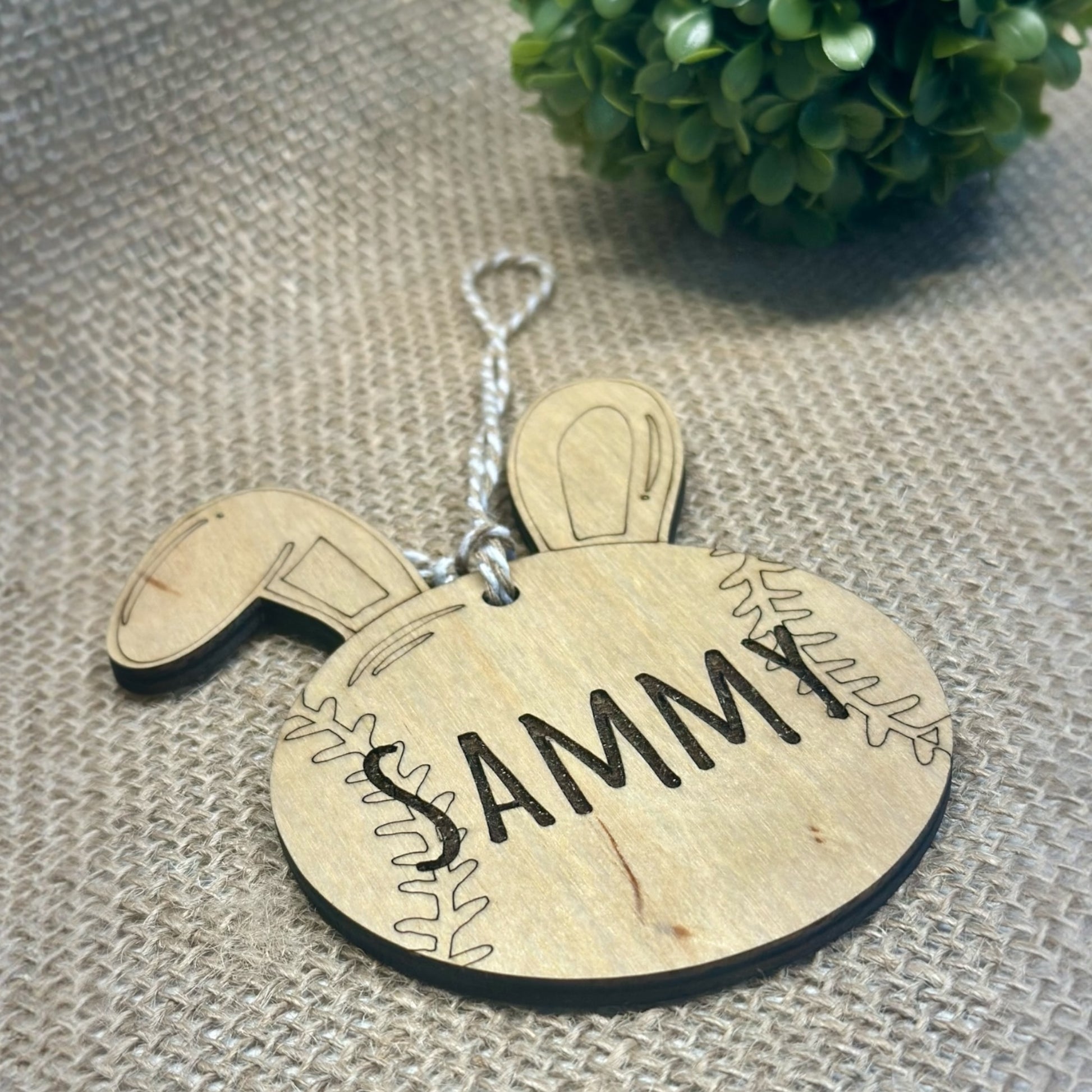 Personalized Easter Basket Tag, Baseball Bunny Ears, Custom Name Wood Tag
